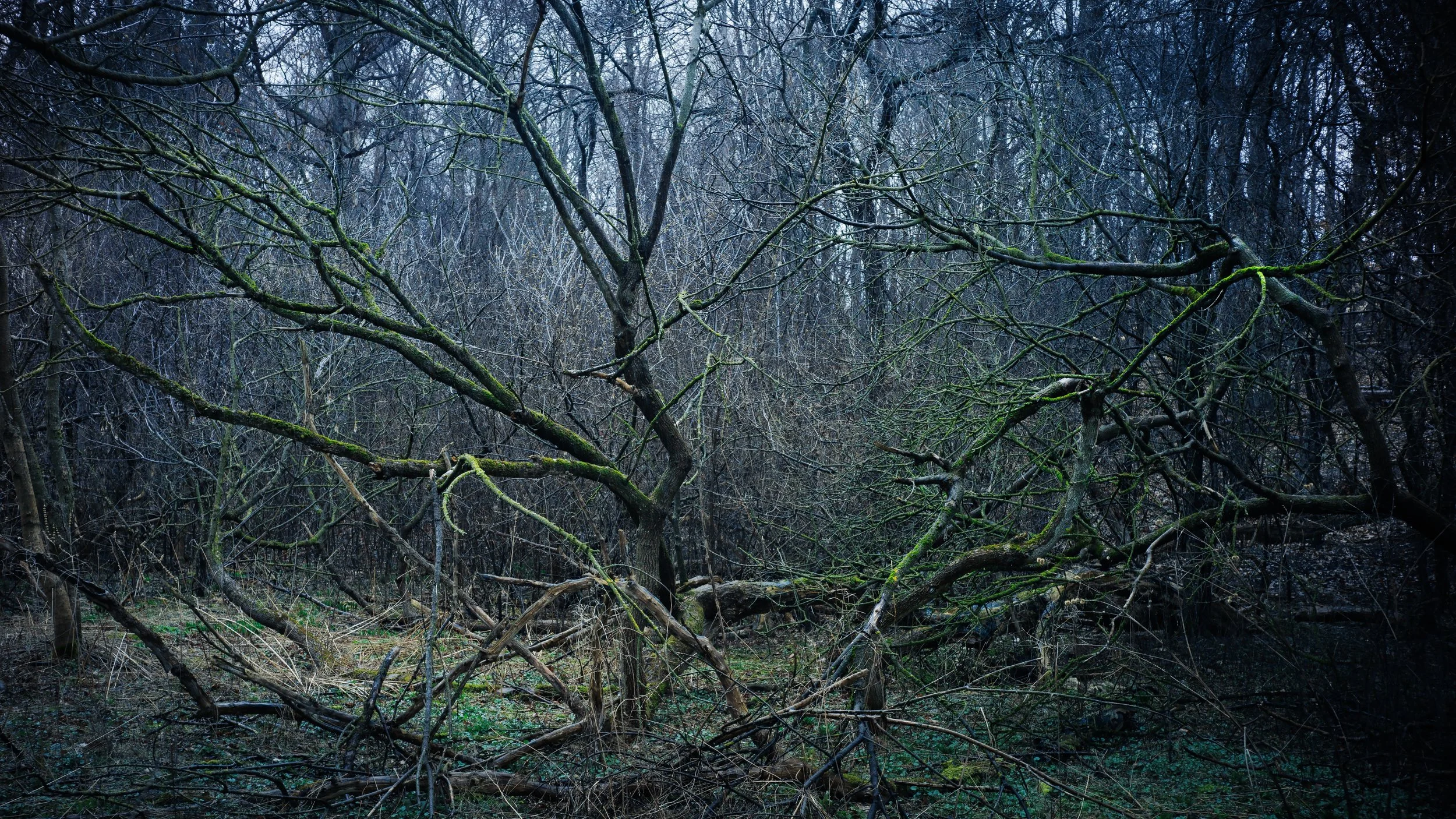 Here is a scene that is very chaotic. However, through the use of framing and colour the tree on the lefthand side anchors the scene. The moss on the branches and the tangle of the broken branches and young saplings tell a dramatic, violent story of trees growing in a wood frequented by storms.